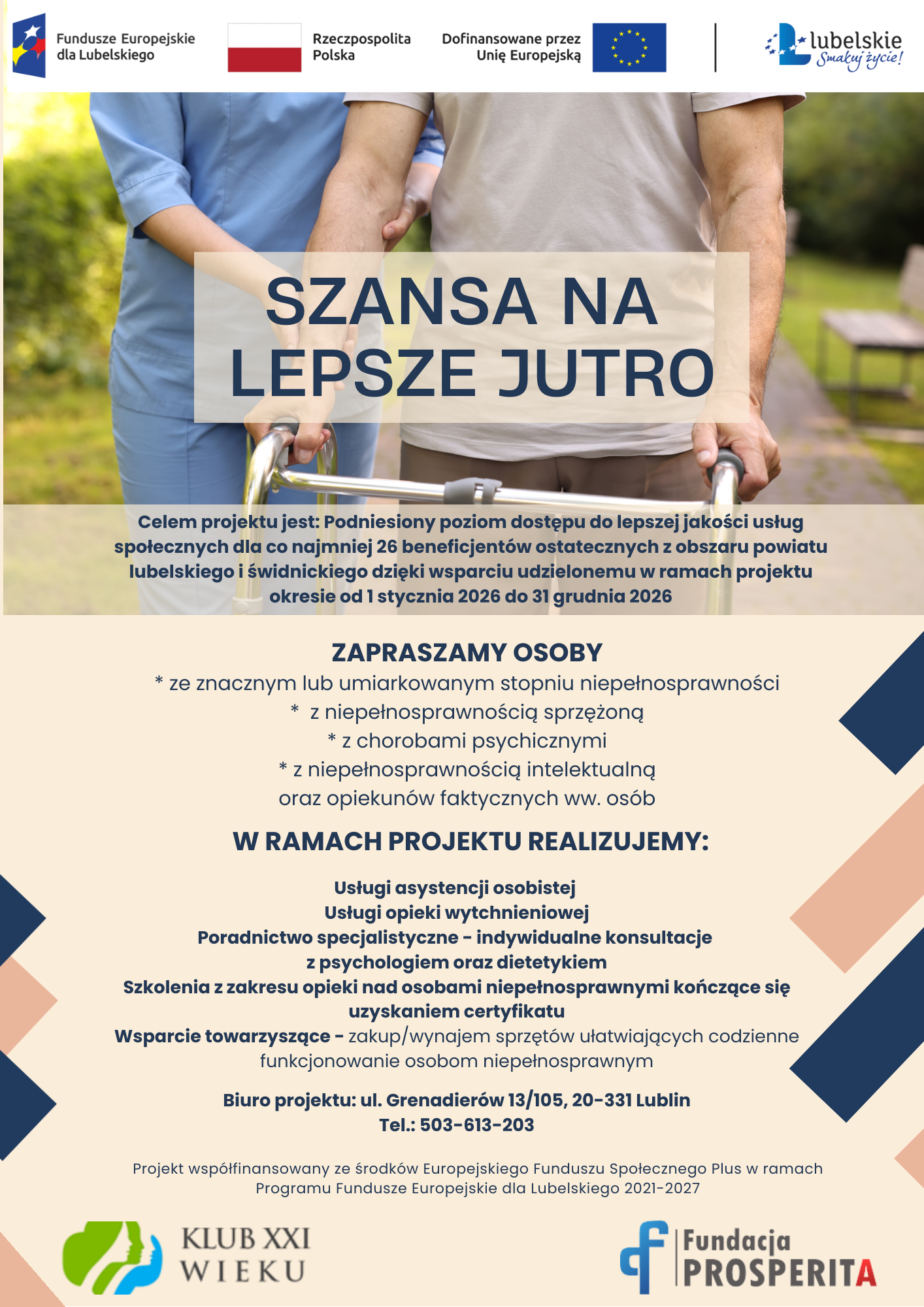 Projekt numer FELU.08.05-IZ.00-0112/25 realizowany przez STOWARZYSZENIE „KLUB XXI WIEKU” wraz z Partnerem Projektu Fundacją PROSPERITA w ramach Programu Fundusze Europejskie dla Lubelskiego 2021-2027 współfinansowany ze środków Europejskiego Funduszu Społecznego Plus.